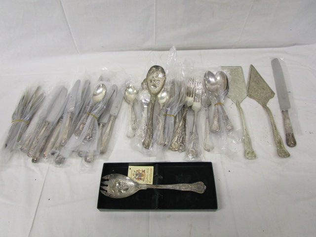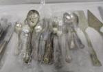 This large, over sixty, assortment of stainless steel/silver plate utensils includes a variety of patterns. These items include a FB Rogers Berry pattern serving spoon, items with the Sheffield Berry pattern, a silver plate King's Pattern cake server, and more. These items are in new and used, good condition. Please preview.
