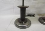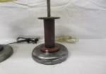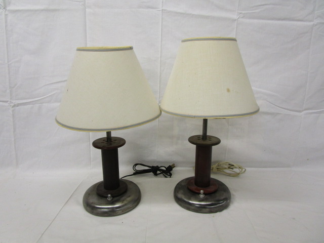 This lovely pair of 17" table lamps with cream colored shades have a "spool column" design with a chrome like base. These items are in used, good condition. Please preview.