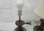 Lovely pair of 17" table lamps with cream colored shades. These lamps have a "spool column" design with a chrome like base.