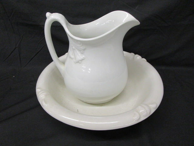 Stunning 11" Royal Daulton white ironstone pitcher and water basin. This pitcher is stamped "M.E. Church Ashburnham".