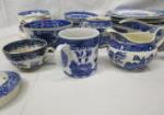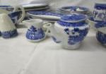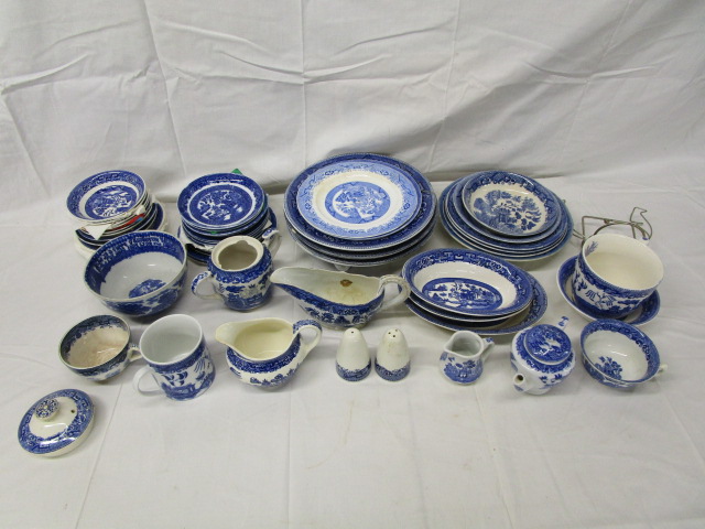 Nice assortment of over fifty pieces of transfer white and blue flow (Blue Willow) porcelain including a pair of salt and pepper shakers, a creamer, a gravy boat, two large mugs, five mis-matched dinner plates, saucers, small serving bowls and more.