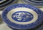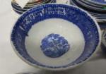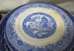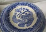 This nice assortment of over fifty pieces of transfer white and blue flow (Blue Willow) porcelain includes a pair of salt and pepper shakers, a creamer, a gravy boat, two large mugs, five mis-matched dinner plates, saucers, small serving bowls and more. Several of these pieces have wear and chips due to age. Please preview.