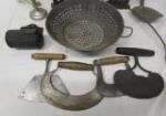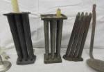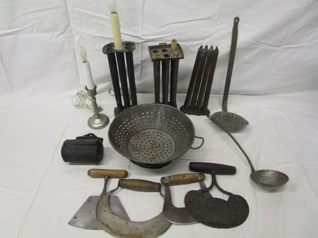Let there be light! Great assortment of candle making items including three tin candle molds (one has been transformed into a table light). Other items include two vintage skimmers, a metal colander, four metal food choppers (mezzalunas) and an antique match holder.