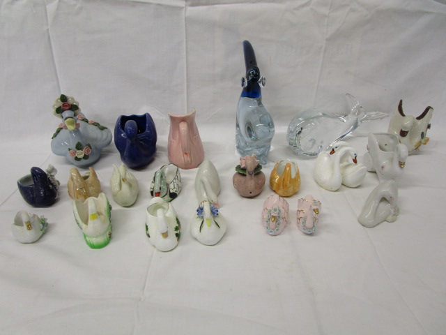 This darling collection of twenty porcelain swan figurines includes a Cordelia porcelain swan, an Adderley English bone China swan, an Elfinware porcelain decorative swan and more. Also included is a 7" blown glass pelican figure and a glass whale figure. These items are in used, good condition. Please preview.
