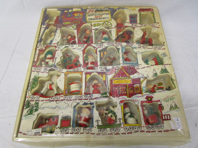 Ho, Ho, Ho! Vintage set of hand-painted Christmas tree ornaments. This set is branded as "Holiday Trim" by Woolworths Co.