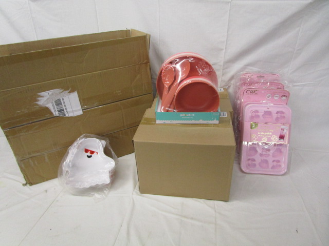 New stock box lot including 3 cases of Ghost shaped bowls (12 bowls in each case), 3 packages of CWC 2-piece berry shaped ice trays, and 2 cases of Pillowfort dinnerware sets (2 sets per case).