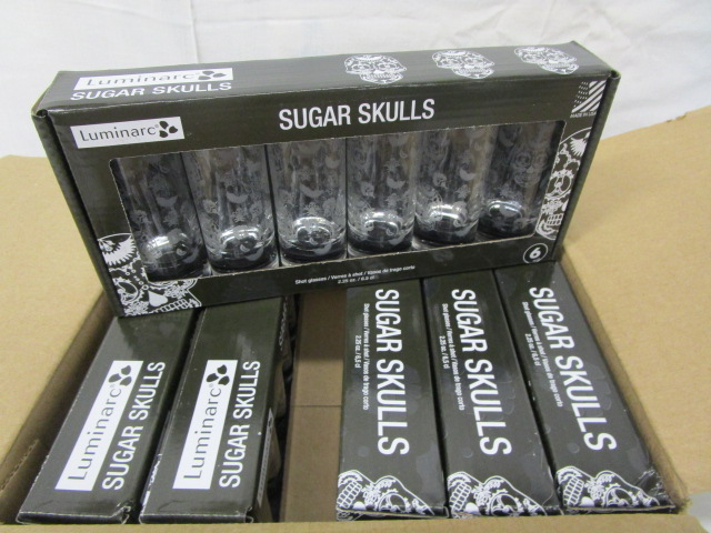 Six boxes of Luminarc Sugar Skulls Shot Glasses. Each box has 6 shot glasses. Please preview.