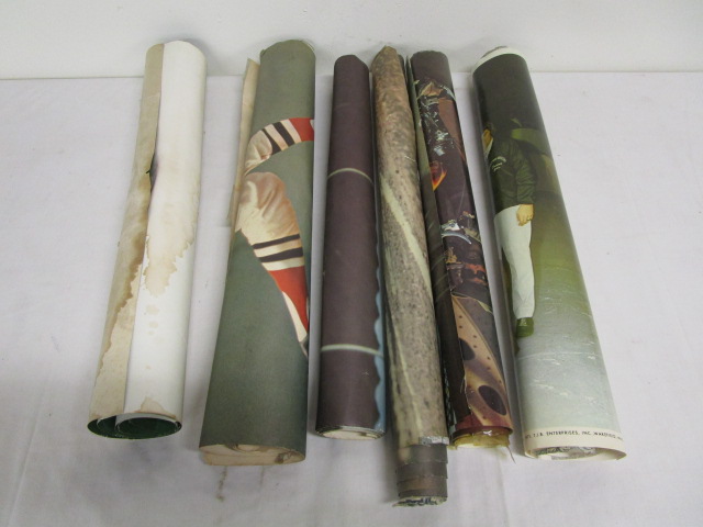 This assortment of seven vintage posters features sports legends including the 1972-1973 Bruins hockey team photo, Mickey Mantle, Larry Bird, and Frank Malzone. Also included is a poster of Peter Fonda from a scene in Easy Rider and an iconic poster of dogs playing pool. These posters are in used, condition. Please preview.