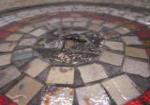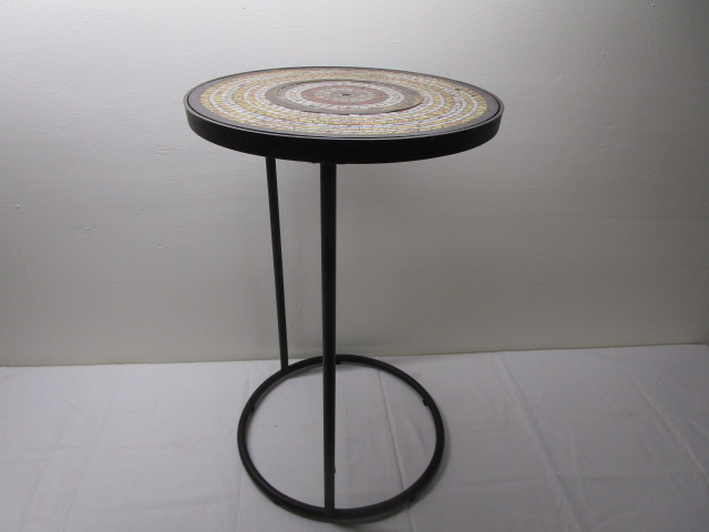 Lovely Pier 1 Imports mosaic round side table featuring an intricate ceramic tile mosaic top and a coated iron frame and base. This table measures 15"W X 24"H.