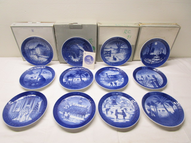 Gorgeous collection of twelve Royal Copenhagen Christmas (dated) Collection plates featuring a beautiful blue and white design. Years include 1970-1993 and four of the plates are in their original boxes.