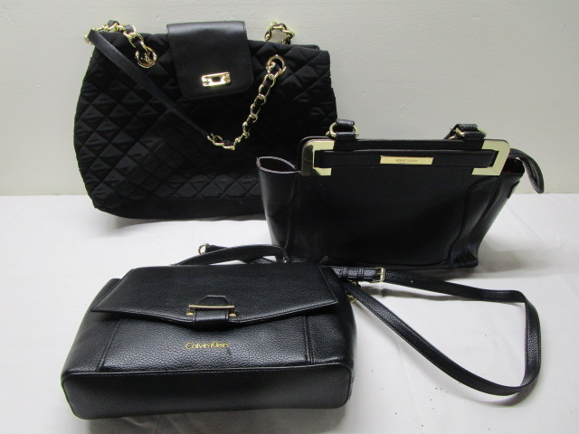 Trio of lovely leather (2) designer purses including an Anne Klein hand bag, a Calvin Klein shoulder bag and a Talbots black shoulder bag with a gold toned chain.