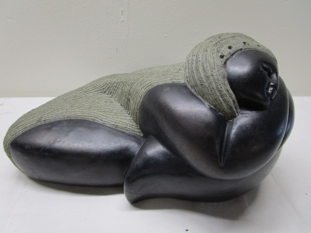 Beautiful 12" Shona style black, stone sculpture of a resting woman. Shona sculptures are a form of Zimbabwean art work.
