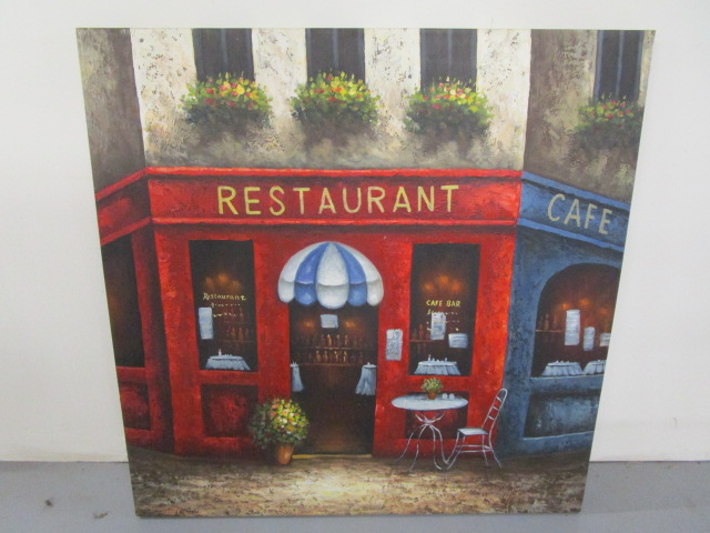 This darling 38" X 38" oil painting (print) on stretched canvas depicts an outdoor restaurant/cafe. This item is in previously owned, good condition. Please preview.