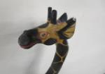 This interesting African style, 40" wooden giraffe sculpture does a chipped ear, ( and a small chip on the back leg) it is previously owned, used, good condition. Please preview.