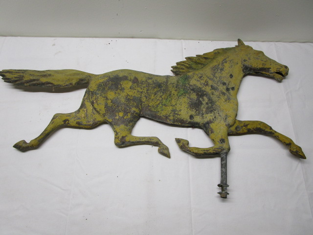 This beautiful antique 31" full bodied (possibly molded copper) running horse weathervane top was purchased from Brookside farm in Westminster, Ma. This item is in antique, previously owned, aged condition. Please preview.