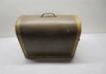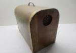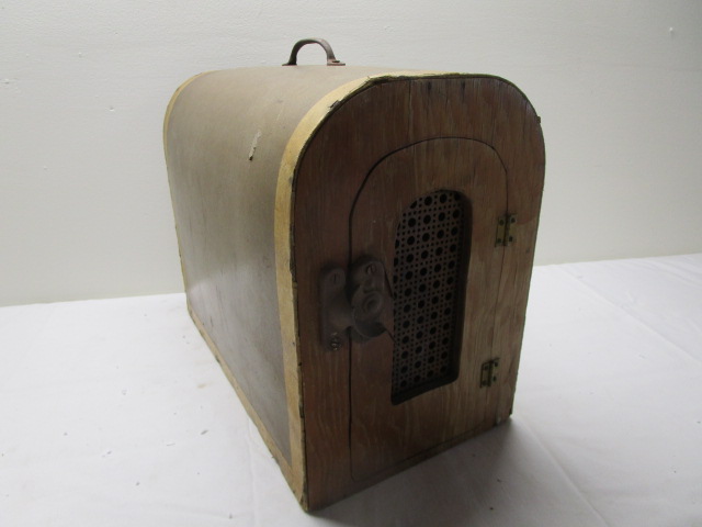 Rare antique wooden domed pet carrier with a perforated front panel for ventilation. It features vintage style hardware including latches and hinges.