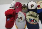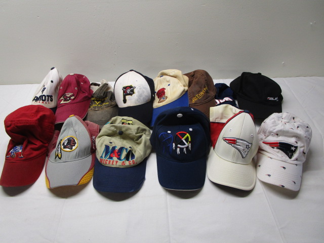 This collection of fourteen baseball style caps include sports team logo hats (including Patriots, B.C., Pirates) a Yellowstone cap, and more. These item are in previously owned, good condition. Please preview.