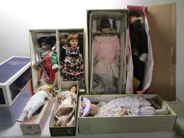 This amazing collection of seven vintage porcelain dolls in their original boxes include a William Tung Collection "Jeanette" doll, a Moments Treasured "Janelle" doll, a Heritage Mint "Amanda" doll, an American Tradition by Brimm's First Lady Gown's Series Dolley Paine Madison doll, a Treasury Collection Paradise galleries Mei Lin doll, a Madison Lee Carmen doll and a World Gallery Celeste doll. These dolls are new, in their original opened boxes. Two of these boxes have some damage due to storage. Please preview.