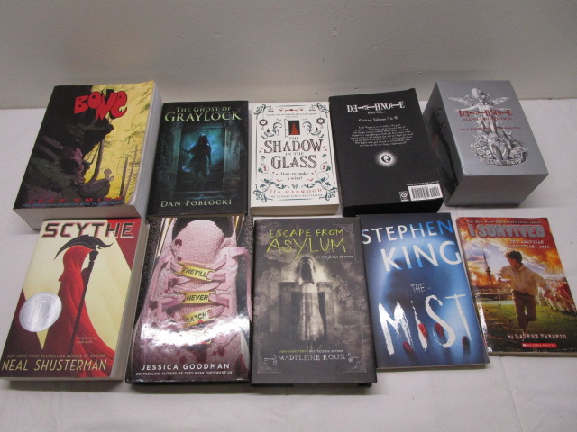 Collection of ten paperback books from the mystery/horror genre. Titles include "Death Note, All In One Edition", Death Note 2- The Black Edition", "Asylum", "The Mist", and more. These items are in used, good condition. Please preview.
