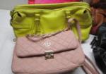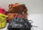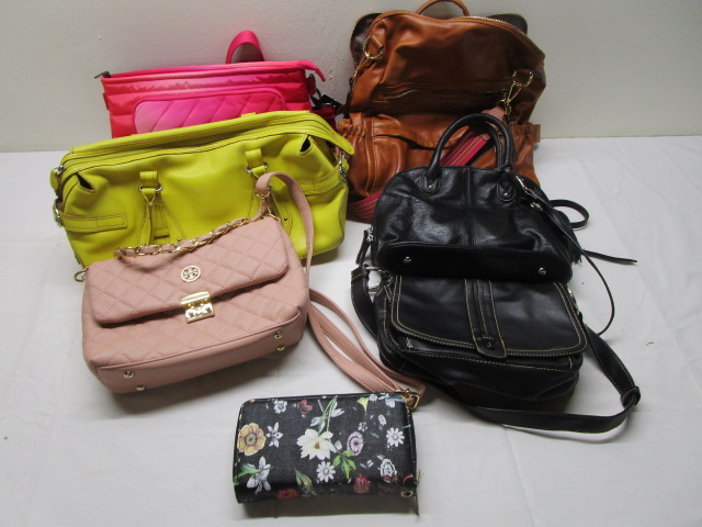 Wonderful assortment of seven ladies' purses including a new "Think Royln" hot pink shoulder bag, a Cole Haan hand bag, a Tignanello black handbag, a brown leather back pack style bag and more.