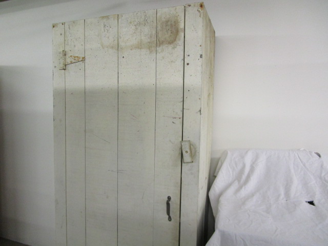 This vintage white, wooden farmhouse style primitive wooden Jelly cabinet with a large door and six shelves measures 38"W X 20"D X 78"H. This item is in previously owned, vintage condition. Please preview.