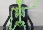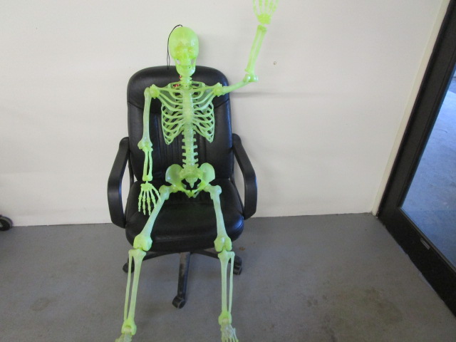 Whimsical 60" glow in the dark heavy plastic poseable skeleton. (Chair not included)
