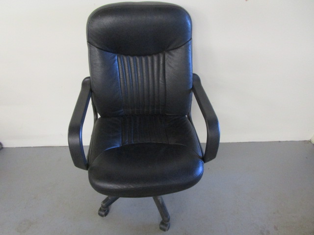 This very nice black leather rolling office chair is in previously owned, good condition. Please preview.
