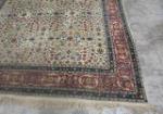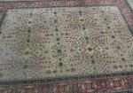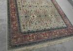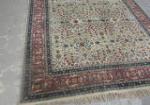 This lovely burgundy, blue and cream color Persian style rug, with fringe, measures 118" X 82". This rug is in previously owned condition. There are some areas of wear due to use. Please preview.