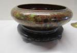 Assortment of miscellaneous home decor items including a vintage Chinese cloisonne' enamel bowl with a carved wooden stand, a vintage copper goose on a stand, an antique cast iron advertising paperweight for Cumner, Jones & Co. and more.