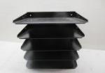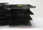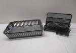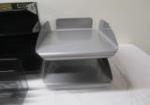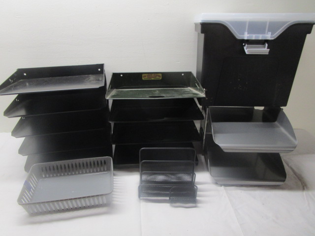 Selection of office supplies to organize your paper work. This selection includes three metal stackable desk letter/document trays, a portable plastic file box, a mail organizer and two plastic trays.