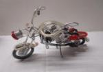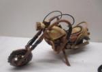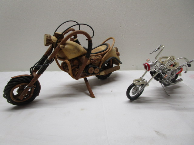 This unique pair of handmade motorcycles includes a 6" motorcycle constructed of wires, coils and tubing. The second 8" motorcycle is constructed of wood and rubber wiring. These items are in previously owned, good condition. Please preview.
