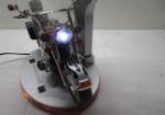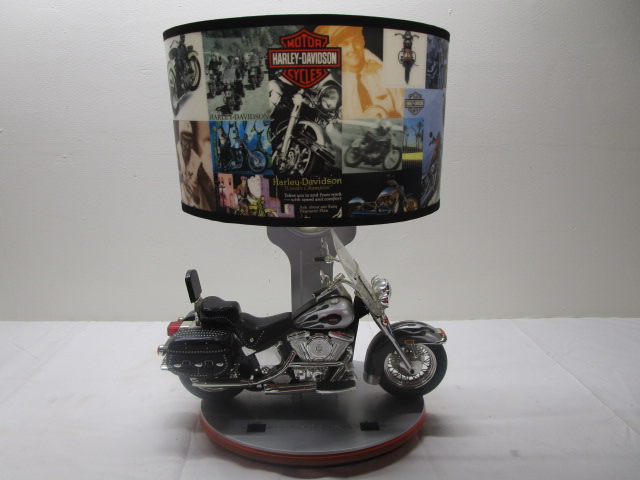 Collectible 17" Harley-Davidson Heritage Softail motorcycle lamp. This lamp features engine sounds, a shade enhanced with Harley Davidson related photos and night light.