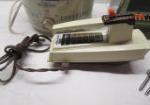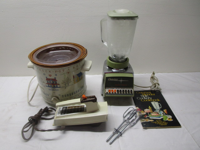 Trio of kitchen appliances including a Rival brand Crock-Pot, an Osterizer blender, and a Sunbeam brand hand mixer.