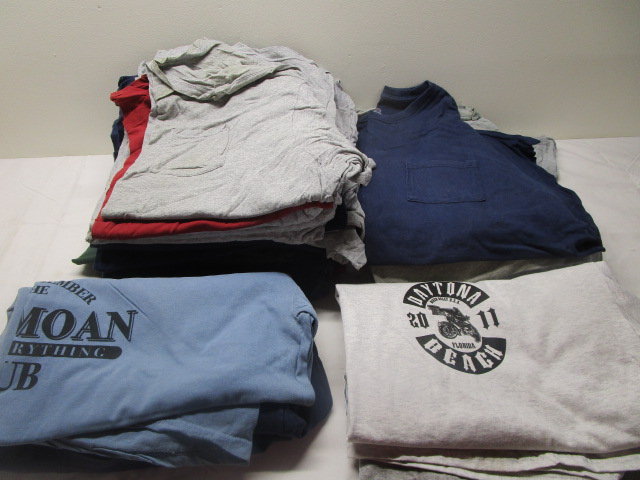 This large assortment of twenty eight t-shirts includes sixteen plain (various colors) size 3X shirts, three logo size 3X shirts and nine plain size 4X t shirts. These items are in previously owned, good condition. Please preview.