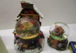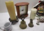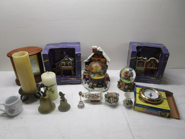 Collection of home decor items including two new in their box "Holiday Time" 2004 Village collectibles buildings (Fire Station and Post Office), a 5" Essex Brass decorative compass, a Santa's Workshop Snow Globe, two brass tone bells, and more. This item is in previously owned condition. Please preview. * After photos were taken, it was noticed that the smaller snow globe in photo #4 was leaking. It has been removed.