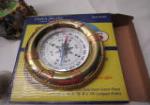 Collection of home decor items including two new in their box "Holiday Time" 2004 Village collectibles buildings (Fire Station and Post Office), a 5" Essex Brass decorative compass, a Santa's Workshop Snow Globe, two brass tone bells, and more.