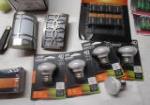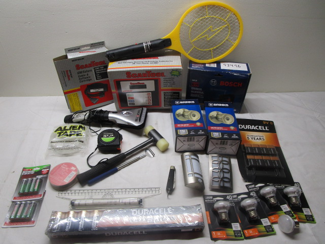 This large assortment of home/auto products includes a Actron 3 Scan Tool diagnostic analyzer for cars, trucks and vans, two (new) Brinks exterior door knobs, a Bosch 5-point Alignment self leveling laser, a new package of 9V batteries, a 12 pack of Duracell D batteries, five new enhance light bulbs, an electronic fly swatter and more. These items are in new and used, good condition. The electronic devices have not been tested and are being offered in as is condition. Please preview.