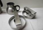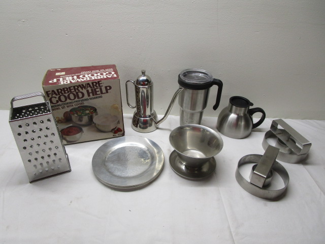 Assortment of household products including two insulated coffee cups, a pair of industrial doughnut/bagel cutters, a Chef's stainless steel coffee pot, a Fabberware set of storage bowls, and cheese grater.