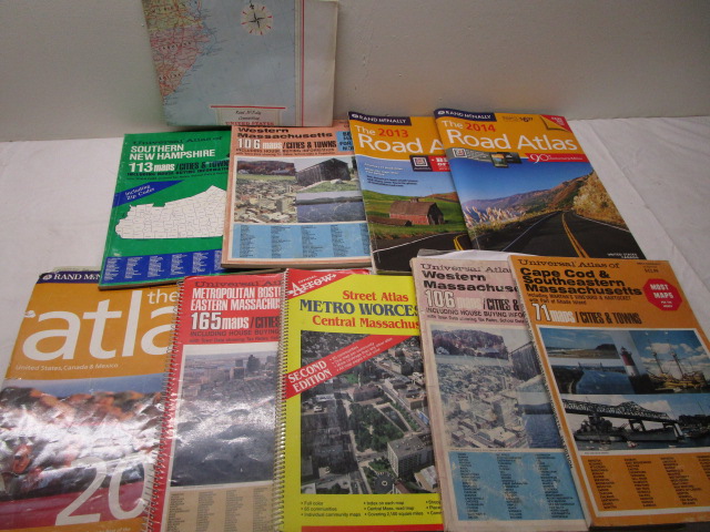 Assortment of nine road Atlas including the 2013 and 2014 Rand McNally road Atlas covering the U.S., Mexico and Canada, The Universal Atlas of Western Massachusetts, The Universal Atlas of Southern N. H. and more.