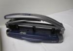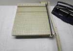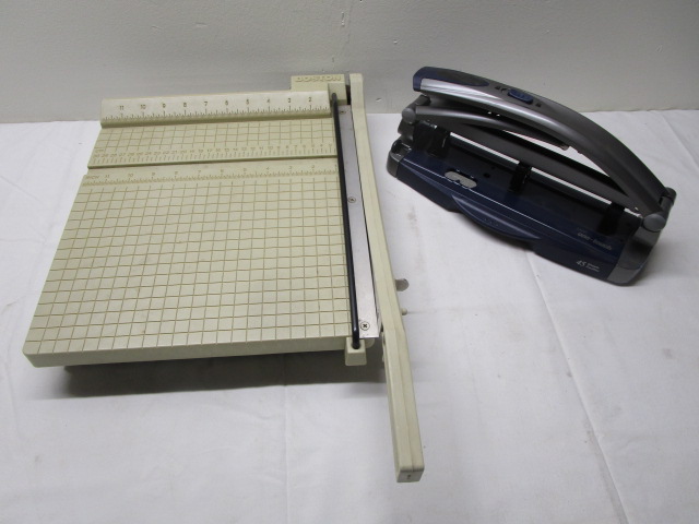 Pair of office tools including a Boston brand paper cutter and a Staples One Touch three hole punch.