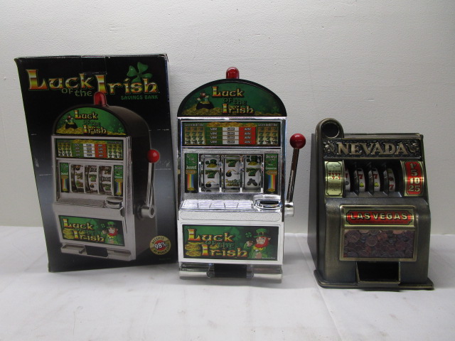 Whimsical pair of Slot Machine Savings Banks including a "Luck Of The Irish" bank and a vintage "Nevada" brand toy slot machine bank.