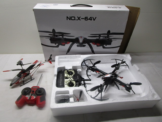 Pair of drones including a XinXun No.X-64V Quadcopter Drone and a an Interceptor 052 Remote Control Helicopter.