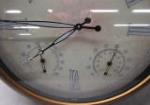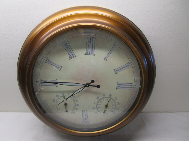 Gorgeous 24" brass tone wall clock featuring large Roman numerals and added humility and temperature dials.