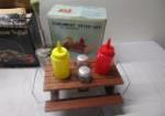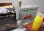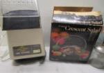This assortment of small kitchen appliances includes a Dazey Seal A Meal storage system, a Salton ice cream machine, a West Bend "Poppery" pop corn popper, and a Kitchen Aid food chopper. Also included is a vintage Condiment Toter set and a set of Crystal Crescent Salad dishes. The appliances in this lot have been tested and each does power up. They are being offered in as is condition. Please preview.