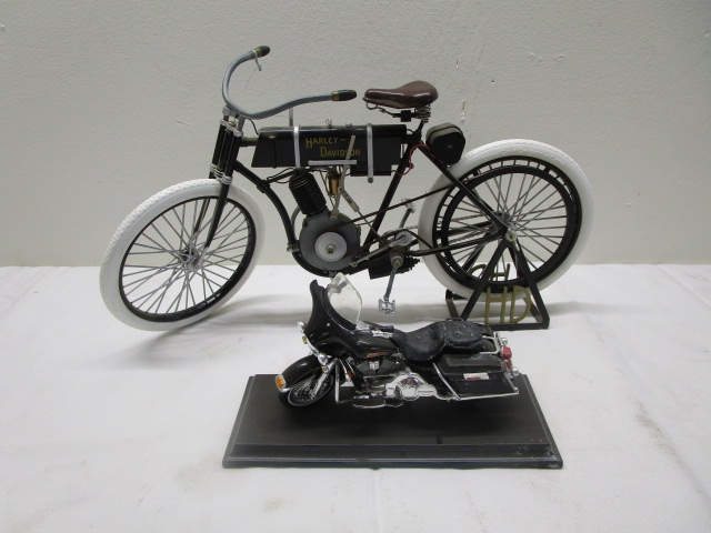This pair of Harley Davidson models includes a replica of the first 1903-1904 1-6 scale Harley Davidson model -1 and a Maisto1:18 scale die-cast model of a Harley-Davidson FLHT Electra Glide Standard motorcycle. These items are in previously owned, good condition. Please preview.