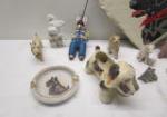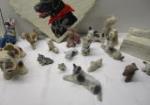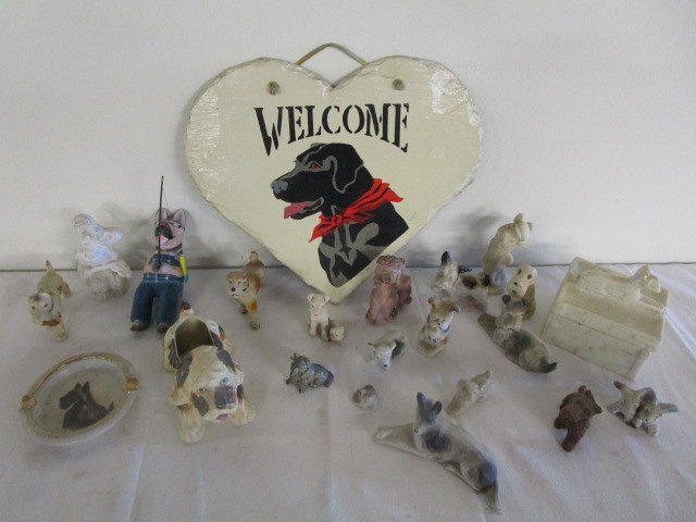 Porcelain, Stone and slate dog figurines, trinket box, ashtray and hanging welcome slate sign. Beautiful assortment, some vintage some newer pieces and sizes range from 2 in to 12 in. Please preview.