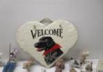 Porcelain, Stone and slate dog figurines, trinket box, ashtray and hanging welcome slate sign.