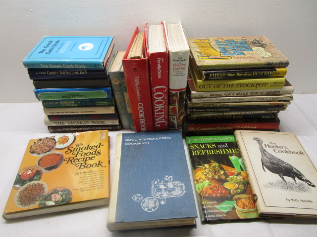 28 cookbook collection featuring Hunter's cookbook, Betty Crocker's cookbook, the Greek cookbook, Country Kitchen cookbook and others.