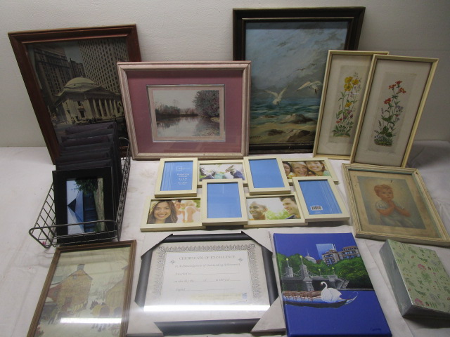 Framed prints and art work with metal baskets and photo album. Sizes amd conditions vary, please preview.