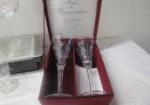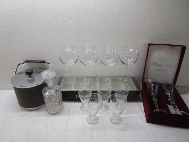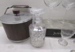 Shannon Crystal stemware in velvet box with Gorgeous Crystal wine glasses and etched footed glasses with a beautiful decanter. Also includes an ice bucket and bar fruit garnish tray.